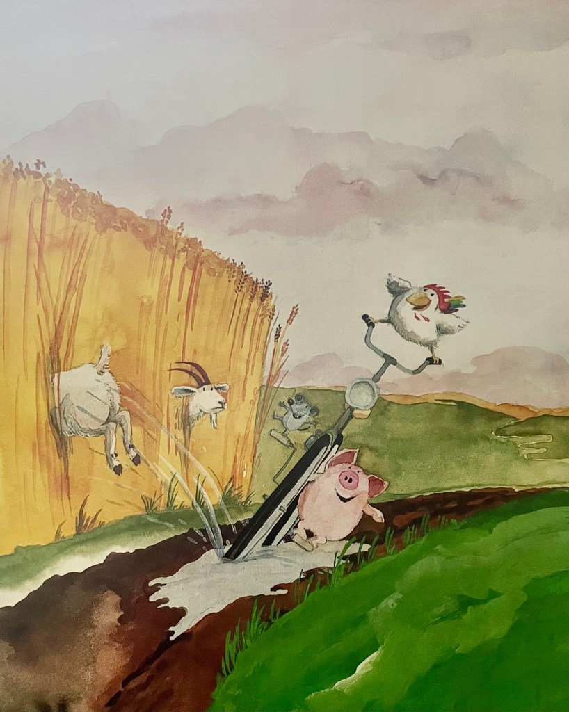 Auf dem Bauernhof erleben die Drei viele Abenteuer, sind gemeinsam unterwegs, spielen und helfen einander. Eines Tages entdecken sie ein altes Boot und werden zu Seeräubern auf dem Teich. Später suchen sich etwas zu essen und geniessen den Tag zusammen bis in die Abendstunden. Als wirkliche Freunde möchten Hahn, Schwein und Maus auch gemeinsam schlafen, doch das stellt sie vor größere Herausforderungen: Das Mauseloch von Johnny ist zu klein, der Schweinestall von Waldemar riecht ein wenig und Franz‘ Hühnerleiter ist zu schwach für alle drei. Aber das macht nichts, denn sie begegnen sich in ihrem Träumen.
