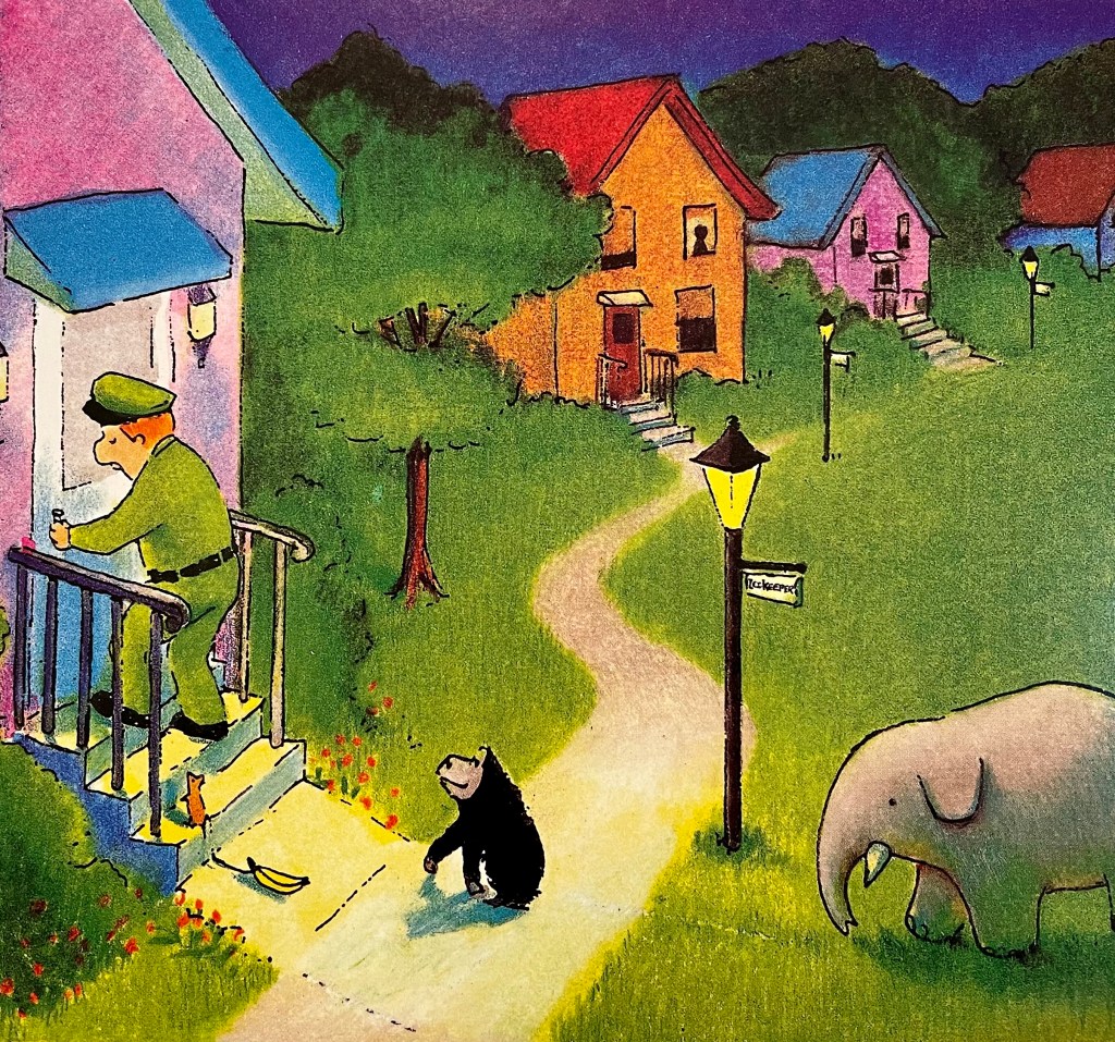 Der Affe kann dadurch nicht nur sich selber, sondern auch den Elefanten, den Löwen, die Hyäne, die Giraffe und das Gürteltier befreien, die sich alle nach und nach hinter dem Zoowärter einreihen. Die Tiere folgen ihm nach Hause und schließlich ins Schlafzimmer. Ein vielstimmiges „‚Gute Nacht!“ erklingt, so dass die Zoowärterfrau die Tiere entdeckt und alle wieder zurück in den Zoo bringt. Wirklich alle?