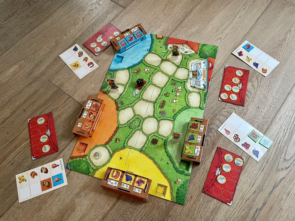 Das Brettspiel bestellt aus einem Start-/Ziel-Feld, Feldern zum Laufen sowie vier Marktständen, die ein unterschiedliches Angebot haben: Bäckerei, Obst- und Gemüseladen, Metzgerei und Feinkost. Jede/r Spieler*in bekommt eine Einkaufsliste zugelost und muss diese an den entsprechenden Ständen nach und nach abarbeiten. Doch Vorsicht, die Produkte kosten unterschiedlich viel und zum Start hat man nur acht Münzen im Geldbeutel. Wird das reichen? Und wer kommt am schnellsten mit vollem Einkaufsbeutel wieder ins Ziel zurück?