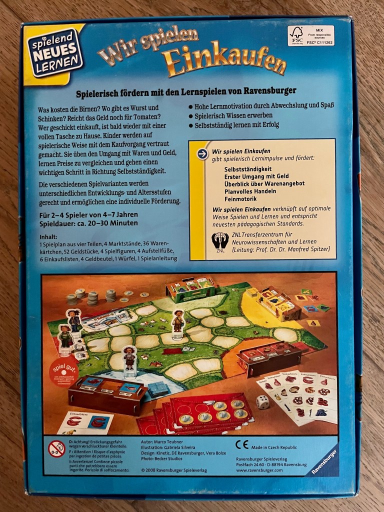 Ganz schön viel auf einmal muss in diesem Spiel beachtet werden: Schnelligkeit, die richtigen Dinge einsammeln und noch mit dem Geld auskommen. Nach ein paar Einführungsrunden, die man am besten gemeinsam spielt, haben die Kinder das Prinzip jedoch schnell verstanden. Dann gehörte es zu unseren immer wieder gerne gespielten Dauerbrennern. Neben dem Spaß fördert ‚Wir spielen Einkaufen‘ auch das Verständnis für den ersten Umgang mit Geld, den Überblick über das Warenangebot zu behalten, planvolles Handeln und die Feinmotorik.