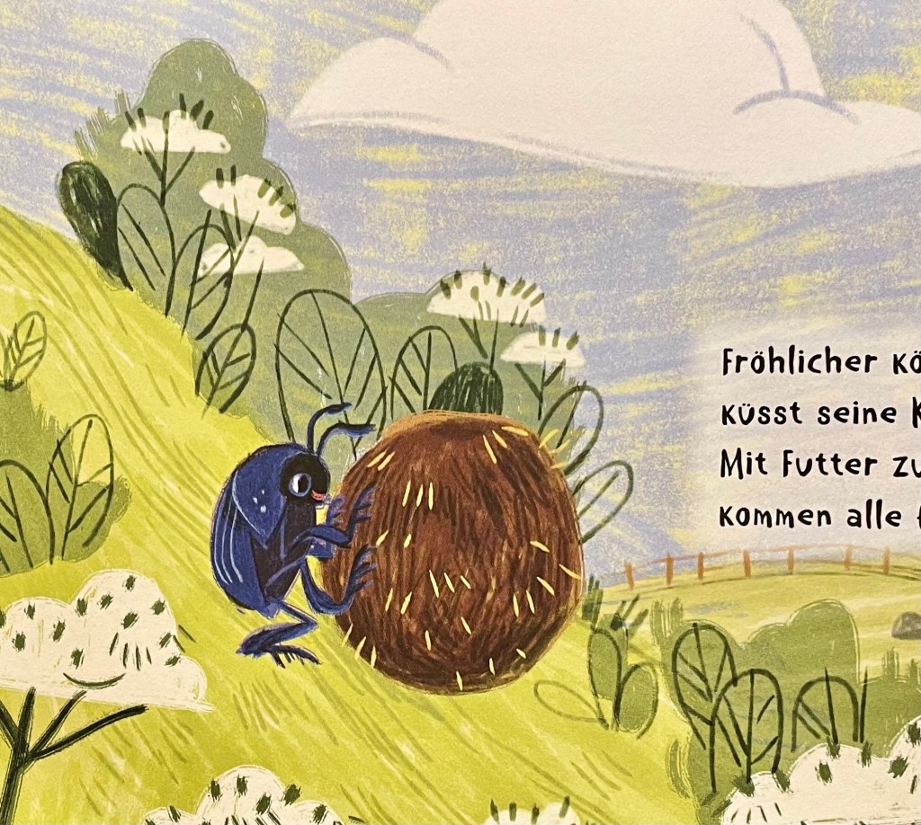 Also macht sich der Käfer auf die Suche und da er nichts findet, fragt er die anderen Tiere nach Kötteln, Würsten, Haufen und wird endlich bei der Kuh fündig. Doch leider kommt ihm das Festmahl abhanden, aber er hat Glück und bekommt doch noch einen richtig schönen, leckeren Pferdeapfel. Mmmmh.